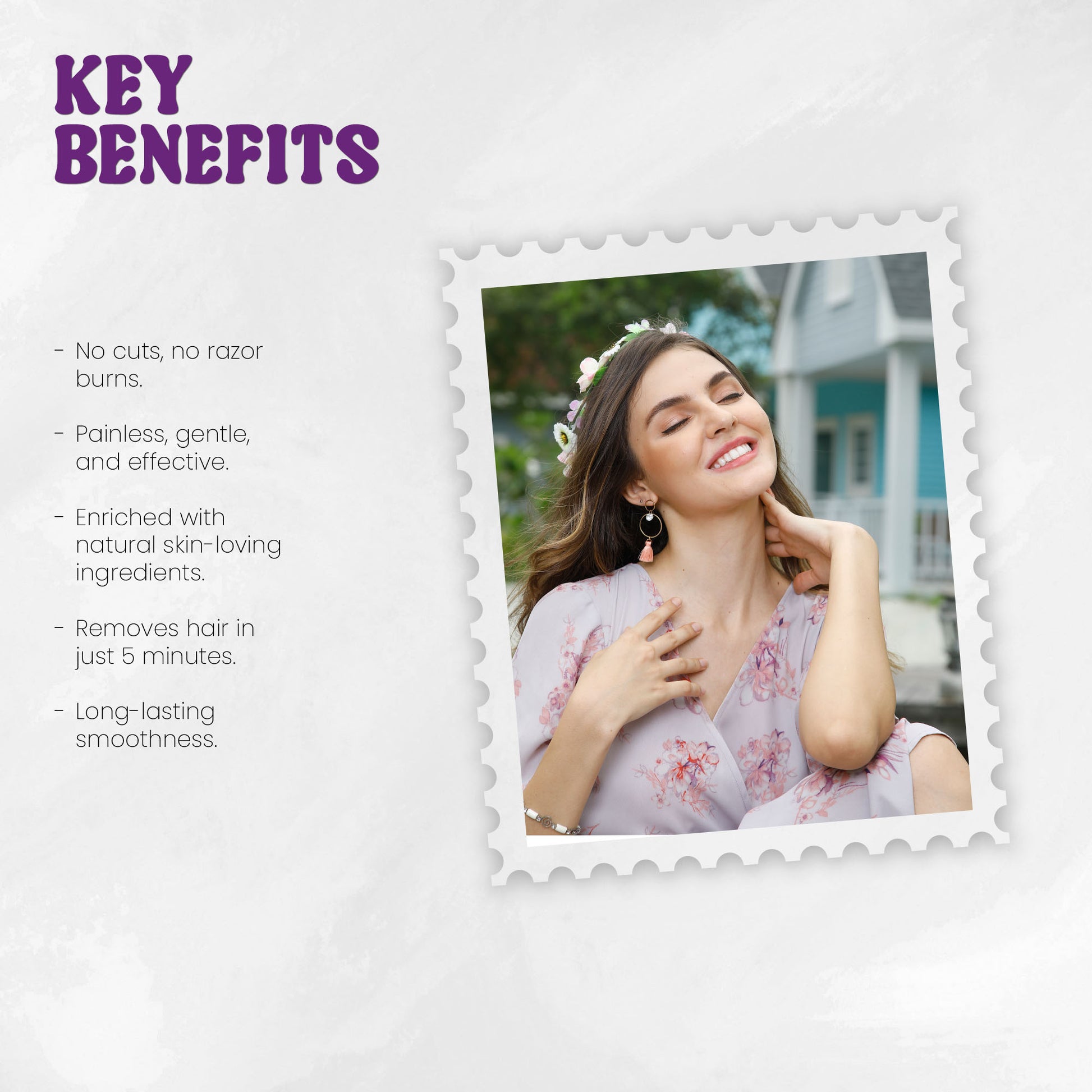 Infused with moisturizing ingredients, our hair removal solution soothes your skin, preventing dryness and irritation while keeping it soft and hydrated.